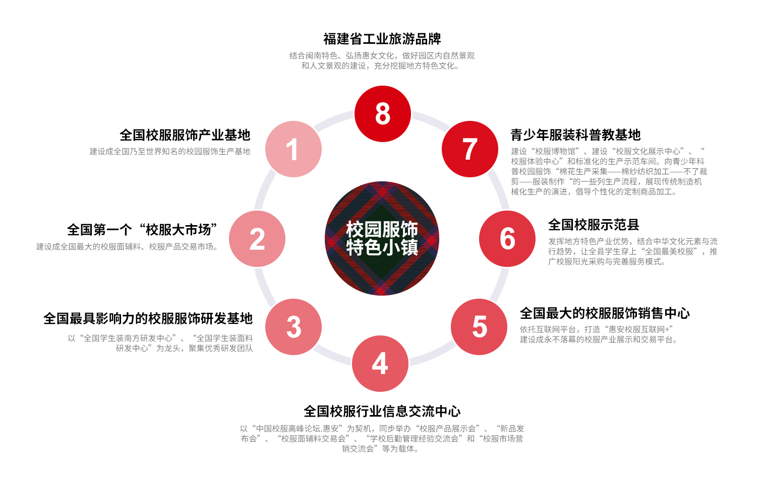 校服產(chǎn)業(yè)是惠安的傳統(tǒng)支柱產(chǎn)業(yè),也是伴隨著改革開發(fā)腳步發(fā)展起來的一個產(chǎn)業(yè)。特別是近年來,在中國教育裝備行業(yè)協(xié)會和上級黨委、政府的關心支持下,惠安的校服產(chǎn)業(yè)進入了高速發(fā)展階段,目前擁有生產(chǎn)企業(yè)500余家、銷售隊伍上萬人,產(chǎn)銷量占據(jù)全國半壁江山?;莅部h委、縣政府高度校服產(chǎn)業(yè)的發(fā)展,研究制定更具針對性的幫扶政策,加大對校服企業(yè)生產(chǎn)性設備引進、招投標等方面的扶持力度,助力產(chǎn)業(yè)做大做強,進一步推動“工業(yè)設計”在惠安校服企業(yè)“落地生根”“生根發(fā)芽”“茁壯成長”;進一步打響中國校園服飾產(chǎn)業(yè)基地品牌,推動中國校園服飾產(chǎn)業(yè)基地落地;進一步完善校服產(chǎn)業(yè)鏈條,彌補企業(yè)研發(fā)短板,做大做強惠安校服產(chǎn)業(yè)。本概念規(guī)劃是為創(chuàng)建“中國校園服飾產(chǎn)業(yè)基地”而進行的探討實踐。