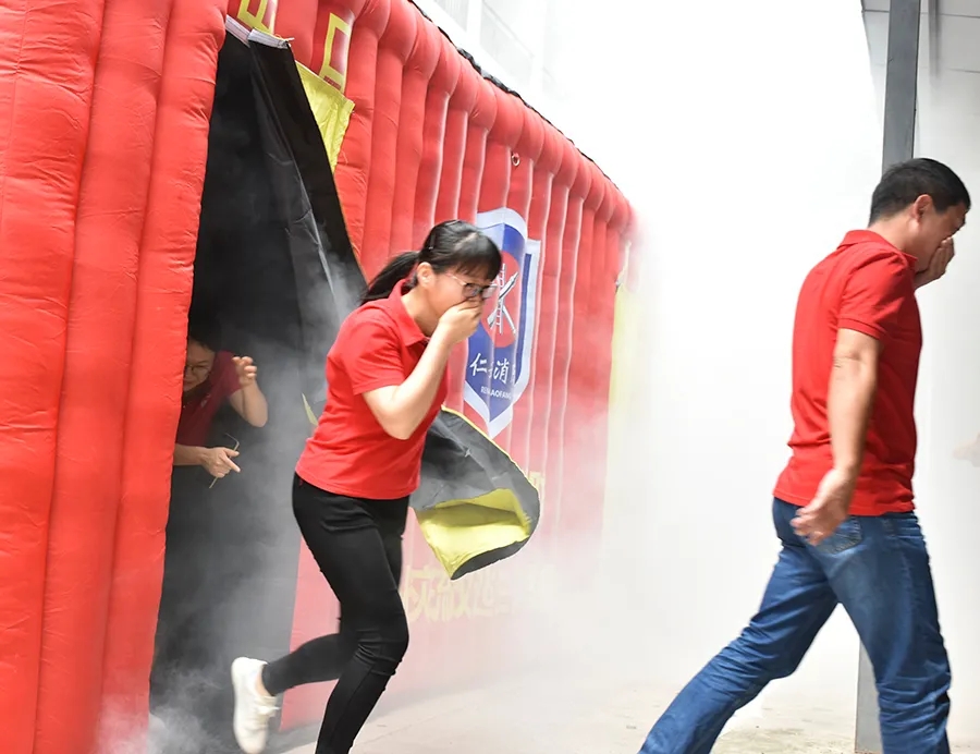 隨后,全體員工進(jìn)行了濃煙體驗(yàn)應(yīng)急逃生和滅火的綜合演練。緊急逃生模擬封閉場(chǎng)館火災(zāi)情景,全體員工在密閉的環(huán)境下演練正確逃生方法。濃煙體驗(yàn)小黑屋被遮得嚴(yán)嚴(yán)實(shí)實(shí),冒出陣陣濃煙,參與實(shí)訓(xùn)的員工在徐教官的指導(dǎo)下,捂住口鼻,俯著身,沿著墻面,一一體驗(yàn)了一把火場(chǎng)逃生的真實(shí)場(chǎng)景。