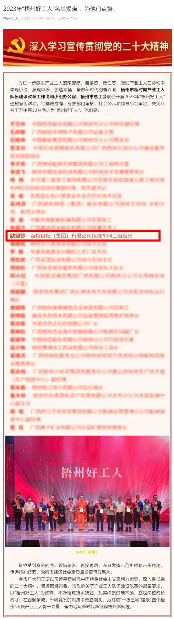 為進(jìn)一步激發(fā)產(chǎn)業(yè)工人的榮譽(yù)感、自豪感、責(zé)任感,激勵(lì)產(chǎn)業(yè)工人在勞動(dòng)中體現(xiàn)價(jià)值、展現(xiàn)風(fēng)采、創(chuàng)造幸福,爭(zhēng)做新時(shí)代的奮斗者,梧州市新時(shí)期產(chǎn)業(yè)工人隊(duì)伍建設(shè)改革工作協(xié)調(diào)小組辦公室、梧州市總工會(huì)聯(lián)合開展2023年“梧州好工人”選樹宣傳活動(dòng)。經(jīng)基層推薦、有關(guān)部門審核、社會(huì)公示和領(lǐng)導(dǎo)小組審定,最終選樹了30名“梧州好工人”。其中,百裕世紀(jì)(集團(tuán))有限公司吊掛車間二組組長(zhǎng)歐堅(jiān)妙榜上有名。