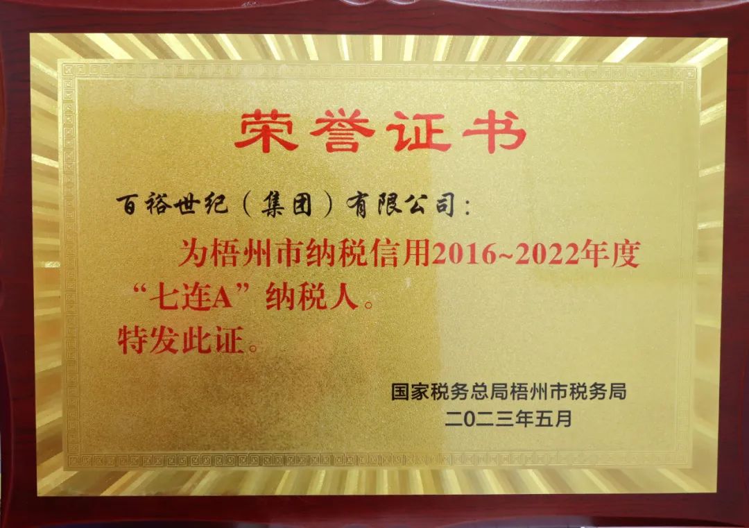 近日,經(jīng)國家稅務(wù)總局梧州市稅務(wù)局評審,百裕世紀(集團)有限公司被評為2016~2022年度“七連A”納稅人,這是我們堅持依法、誠信經(jīng)營的實質(zhì)成果。