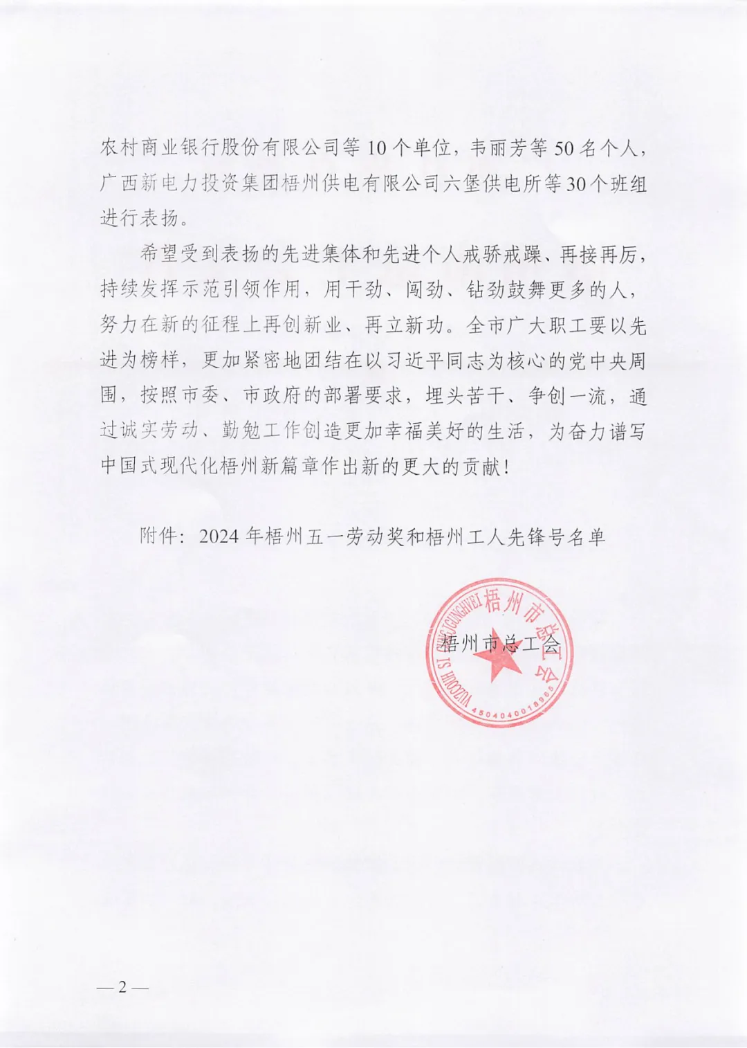 4月26日,梧州市總工會(huì)印發(fā)《梧州市總工會(huì)關(guān)于表?yè)P(yáng)2024年梧州五一勞動(dòng)獎(jiǎng)和梧州工人先鋒號(hào)的通報(bào)》,百裕世紀(jì)(集團(tuán))有限公司羅獻(xiàn)鳳同志榮獲2024年“梧州五一勞動(dòng)獎(jiǎng)?wù)隆薄?/span>