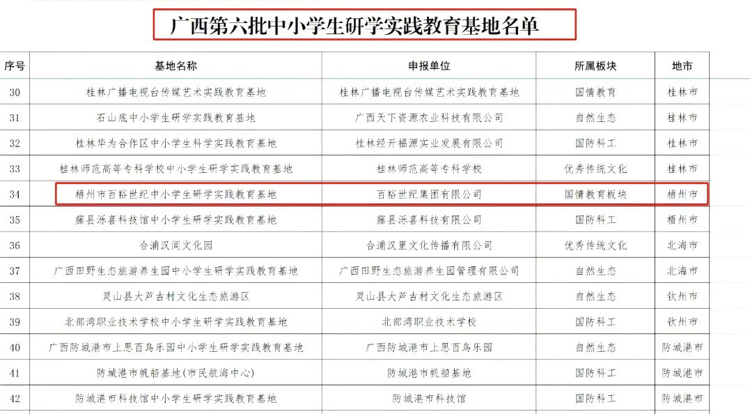 根據(jù)《自治區(qū)教育廳關(guān)于開展2024年全區(qū)中小學(xué)生研學(xué)實(shí)踐教育系列評(píng)選活動(dòng)的通知》(桂教基教〔2024〕13號(hào))要求,自治區(qū)教育廳組織各地開展廣西第六批中小學(xué)生研學(xué)實(shí)踐教育基(營(yíng))地和2024年中小學(xué)生研學(xué)實(shí)踐教育精品課程(線路)申報(bào)推薦工作。百裕世紀(jì)(集團(tuán))有限公司入選廣西第六批中小學(xué)生研學(xué)實(shí)踐教育基地名單。