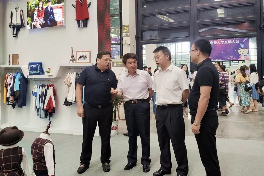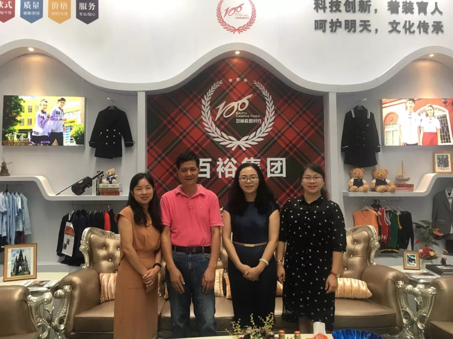 百裕集團工作人員向現(xiàn)場來賓講解百裕校園時代當季服裝的品牌理念和款式設計。時尚美觀又不乏個性的校園服飾引起了現(xiàn)場觀眾濃厚的興趣,大家紛紛駐足觀看、詢問交流。期間,工作得到了各級領導的現(xiàn)場指導。
