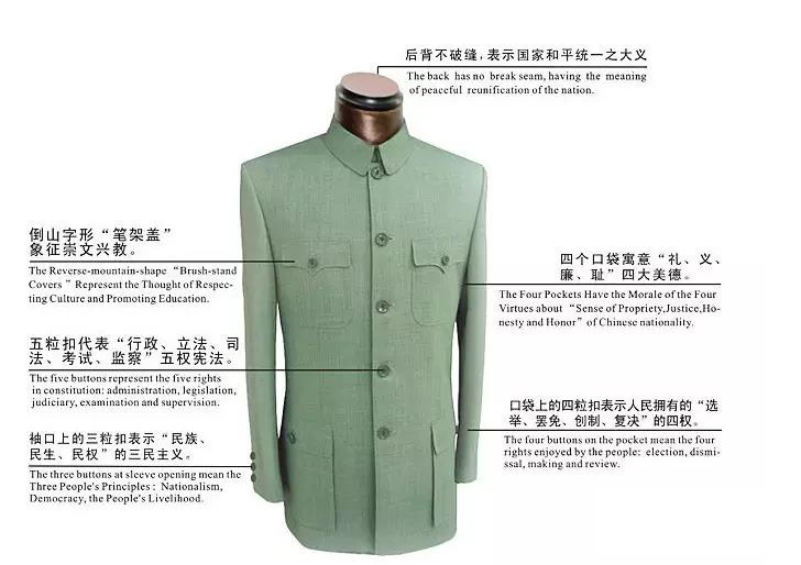 前襟的五粒紐扣和五個口袋(一個在內(nèi)側(cè))分別表示孫中山先生的五權(quán)憲法學(xué)說(行政權(quán)、立法權(quán)、司法權(quán)、考試權(quán),還有監(jiān)察權(quán)在領(lǐng)口(紐扣)和內(nèi)側(cè)(口袋),以彰顯監(jiān)察權(quán)的人民監(jiān)督作用);