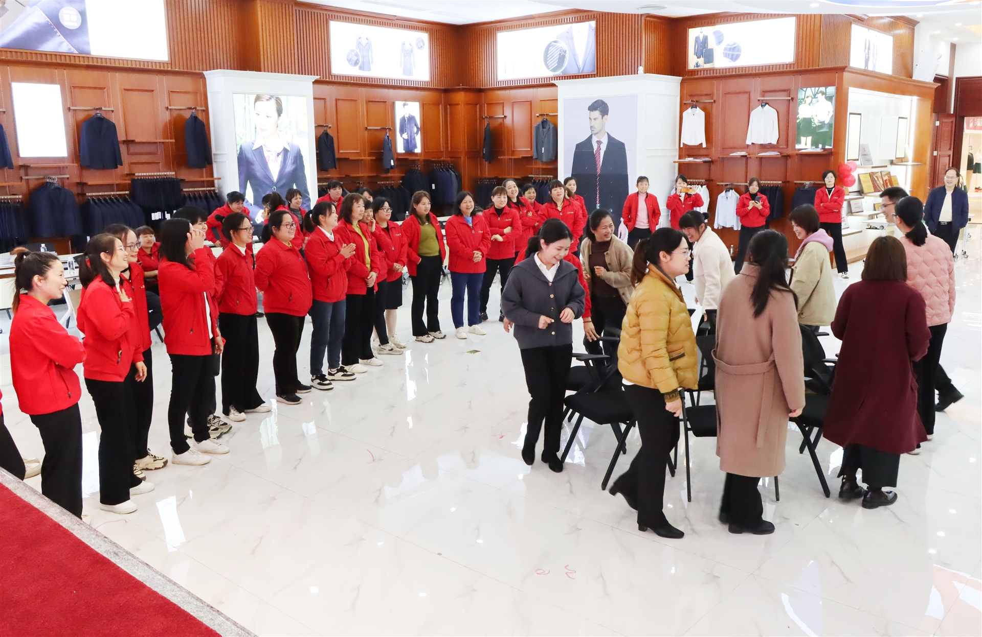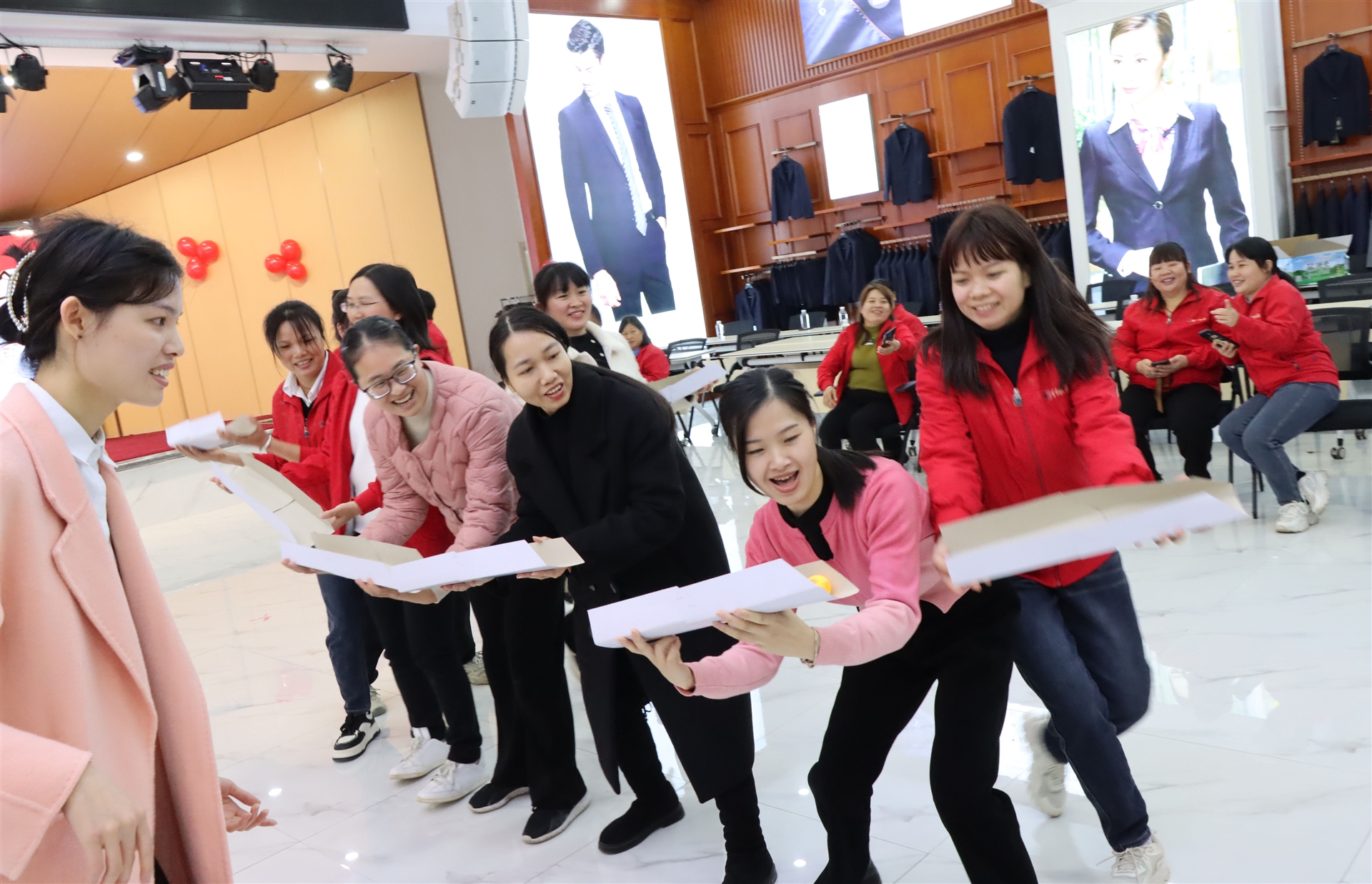搶凳子比賽中,女士們仿佛變身為矯健的豹子,眼中閃爍著競爭的光芒。而珠行萬里活動則更像是她們展示優(yōu)雅與力量的舞臺,每一次珠子的傳遞都伴隨著她們的歡笑和尖叫。整個會議室仿佛被她們的熱情點燃,熱鬧喜慶的氣氛彌漫在每個角落。會議室洋溢著熱鬧喜慶的氣氛,展現(xiàn)了新時代女性的時代風(fēng)彩。
