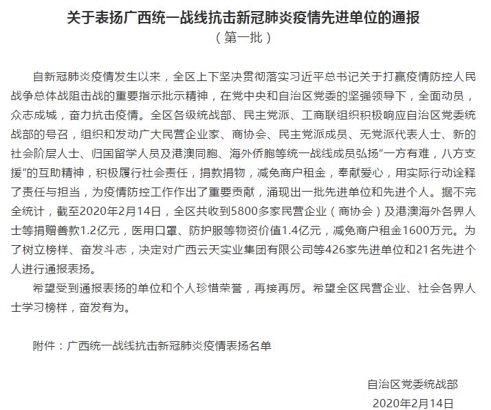 2月14日,自治區(qū)黨委統(tǒng)戰(zhàn)部表?yè)P(yáng)447個(gè)抗疫先進(jìn)單位(個(gè)人),百裕集團(tuán)在這次新冠肺炎病毒疫情愛心公益行動(dòng)中,積極擔(dān)當(dāng)作為,認(rèn)真履行企業(yè)應(yīng)盡的社會(huì)責(zé)任,捐款、捐物等公益表現(xiàn)得到了自治區(qū)統(tǒng)戰(zhàn)部的表?yè)P(yáng),我們將珍惜榮譽(yù),再接再厲,為打贏防控狙擊戰(zhàn)做出貢獻(xiàn)。